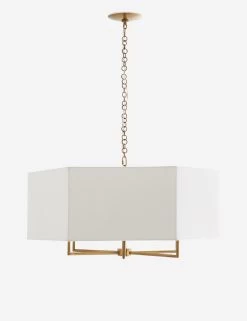 A hexagonal drum shade casts a clean, geometric silhouette in the Oxford chandelier. Burnished accents finish the look, offering this modern chandelier an effortless transitional appeal—perfect for a touch of sophistication in your dining room or lounge.