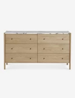 Our Philana dresser brings a touch of polish to any bedroom edit. A honey finish highlights the natural grain warmth of the frame, grounding the luxe marble top with organic appeal. Six spacious drawers offer ample storage to this balanced design for a modern dresser with timeless appeal.