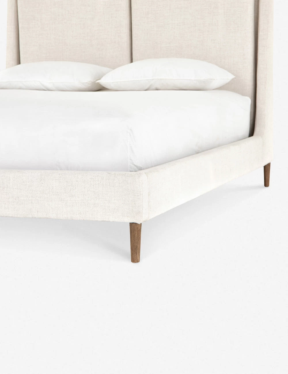 Upholstered in a soft linen blend, this bed frame features a winged design with a cushion-back headboard in a remarkably balanced, layered form. Wire-brushed wood legs finish this upholstered platform bed with a timeless appeal.