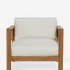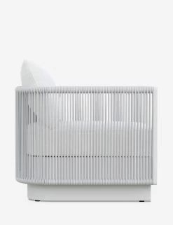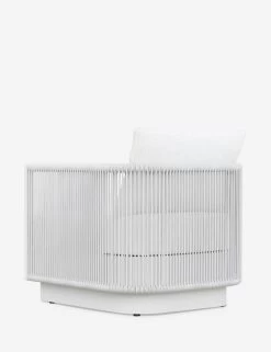 The Romero accent chair cuts a clean, modern silhouette in white. The aluminum frame features all-weather rope accents adding texture and accentuating the blend of precise angles and rounded lines. With its performance cushions, this chair is set for effortless elegance in a refined patio or sunroom edit.