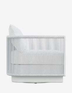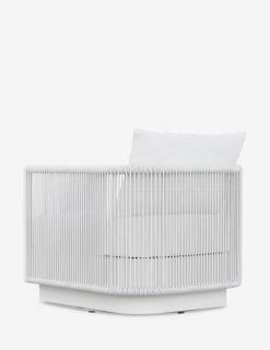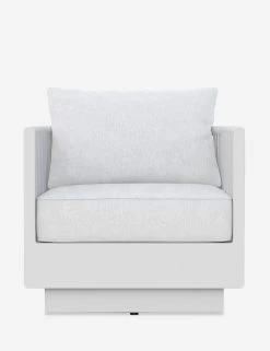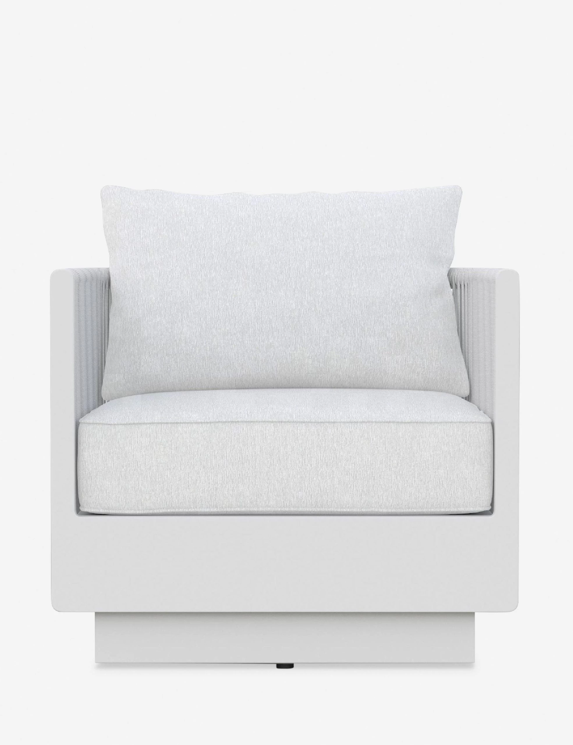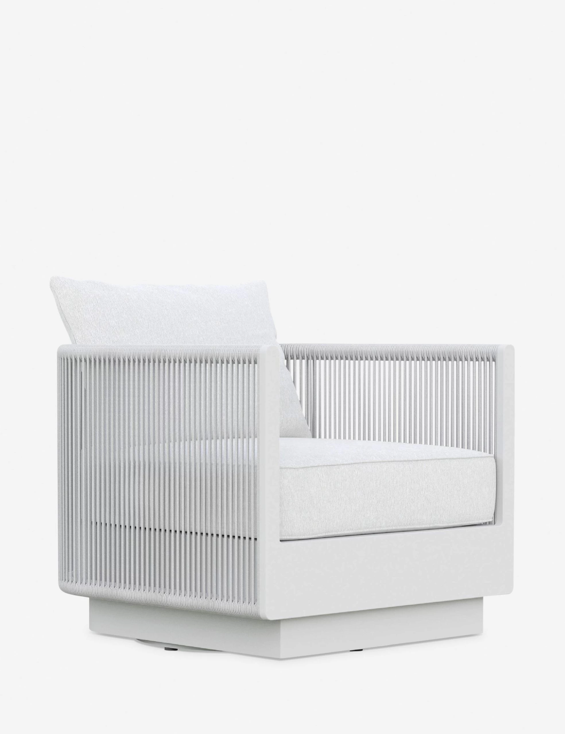 The Romero swivel chair cuts a clean, modern silhouette white. The aluminum frame features all-weather rope accents adding texture and accentuating the blend of precise angles and rounded lines. Performance cushions offer effortless elegance, with the swivel base bringing a conversational edge to the chair’s design.