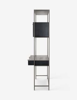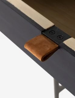 A slim iron frame lends this poplar desk and cabinet a floating look. Its dark finish, leather pulls, and modern silhouette offer a sleek desk space with plenty of surfaces and storage that can be decked with luxe decor and accents or left sparse for a touch of mid-century minimalism.