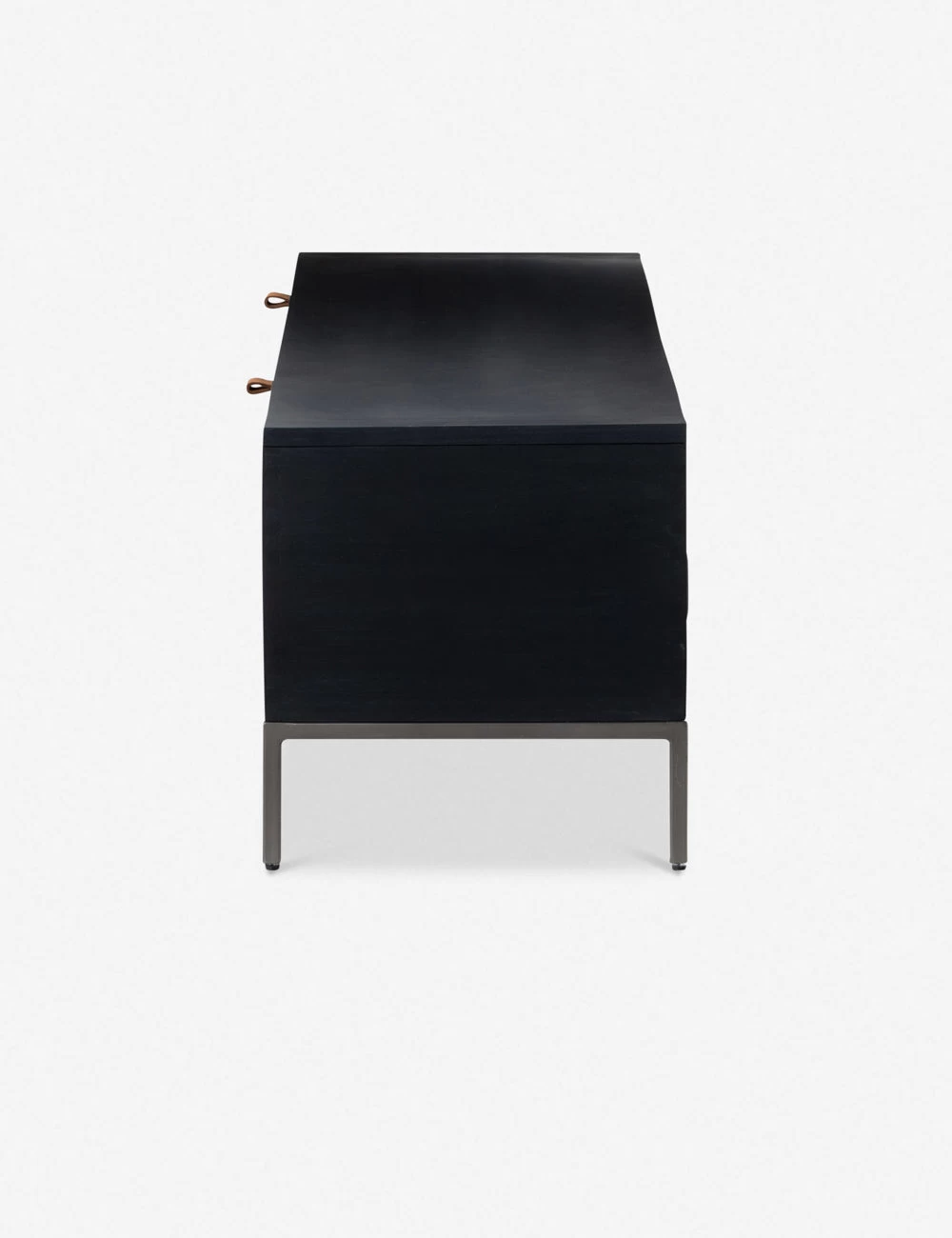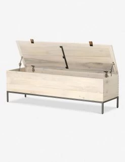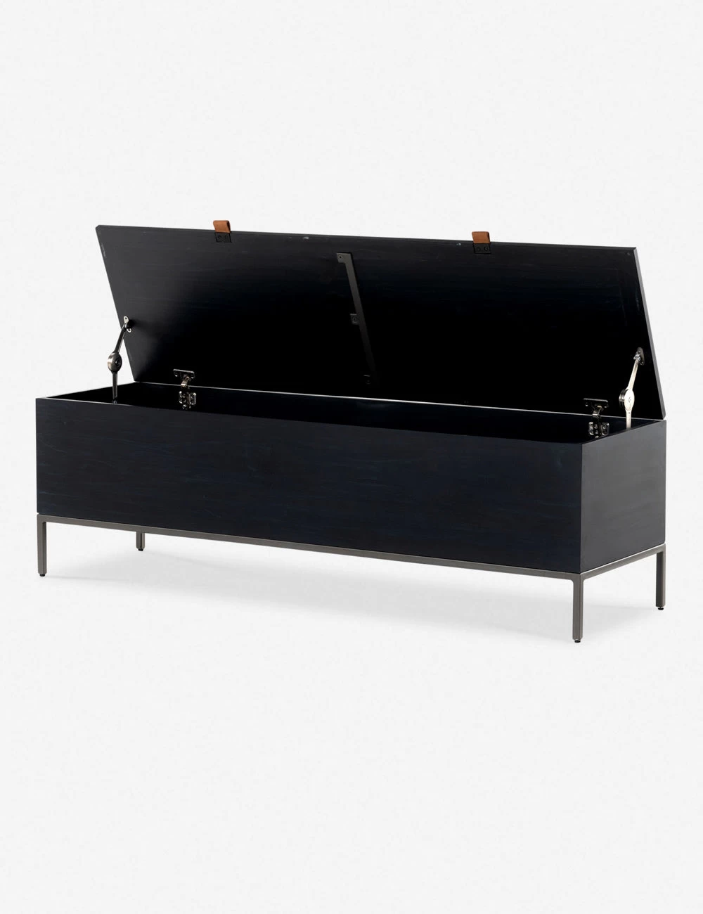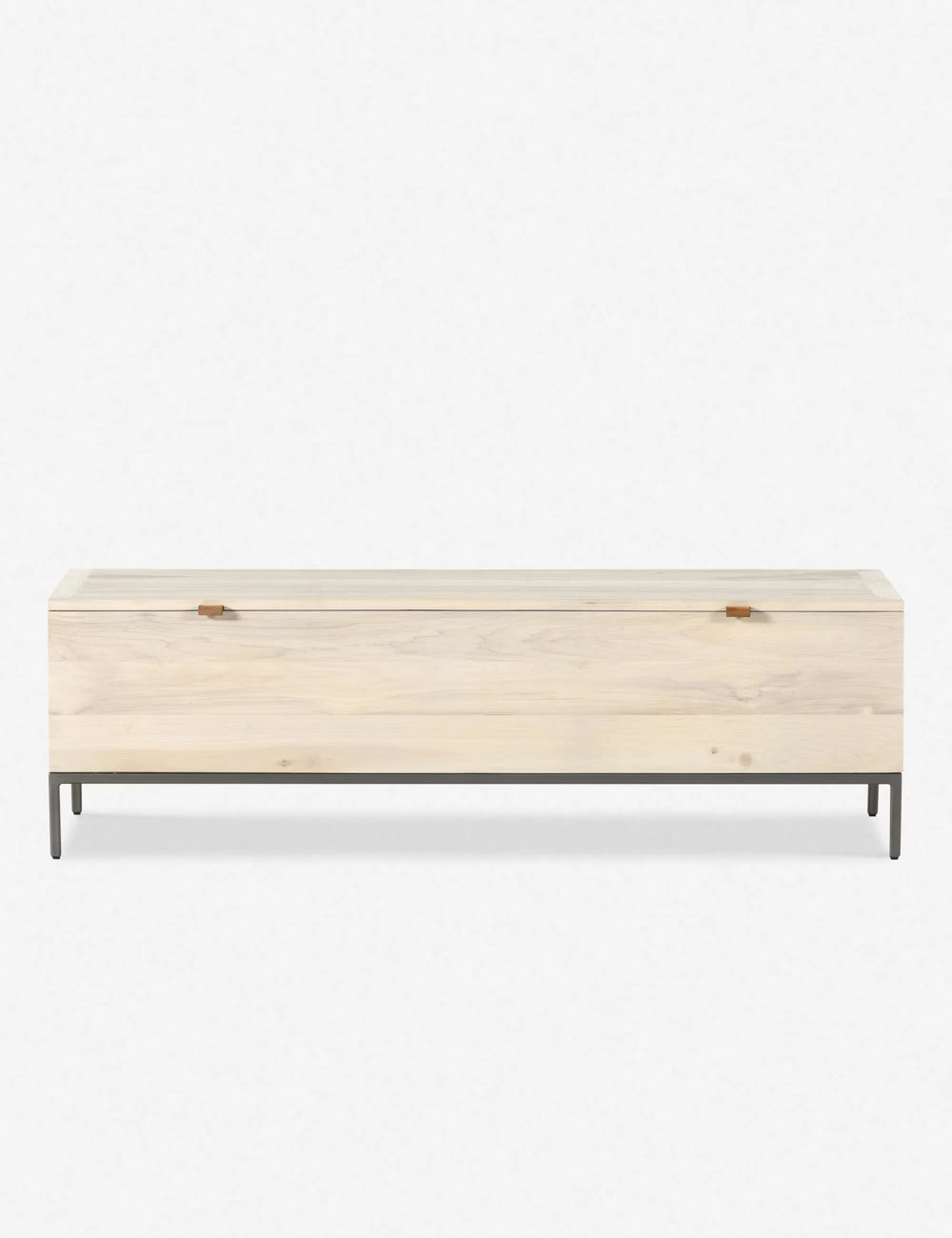 Keep your living space or entry grounded (and super organized) with this sleek trunk. This storage bench features elements of mid-century aesthetics like a poplar wood construction, slim iron base, and top-grain leather pulls.