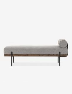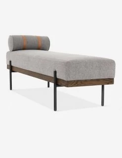 Textural gray upholstery, a bolster cushion, and top-grain leather details lend an elevated feel to this bench-style seat. A honey-finished oak base and blackened iron legs finish things off for a sleek material mix. Its bolster can be repositioned and secured by the leather buckle straps, so this bench easily adapts to fit your needs in the entry, living room, or at the foot of your bed.