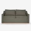 Channel tufting along the base creates a plush couch design piled high in lounge appeal. Soft lines and a plinth base give this inviting sofa a chic air that can style from cozy modern to graceful and refined.