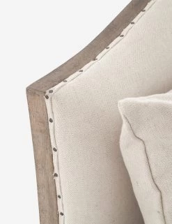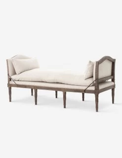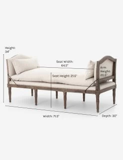 With a touch of old-world style this charming chaise features carved legs and a distressed wood frame. The ivory cushions soften the look, while nailhead trim and metal hardware bring an industrial influence.