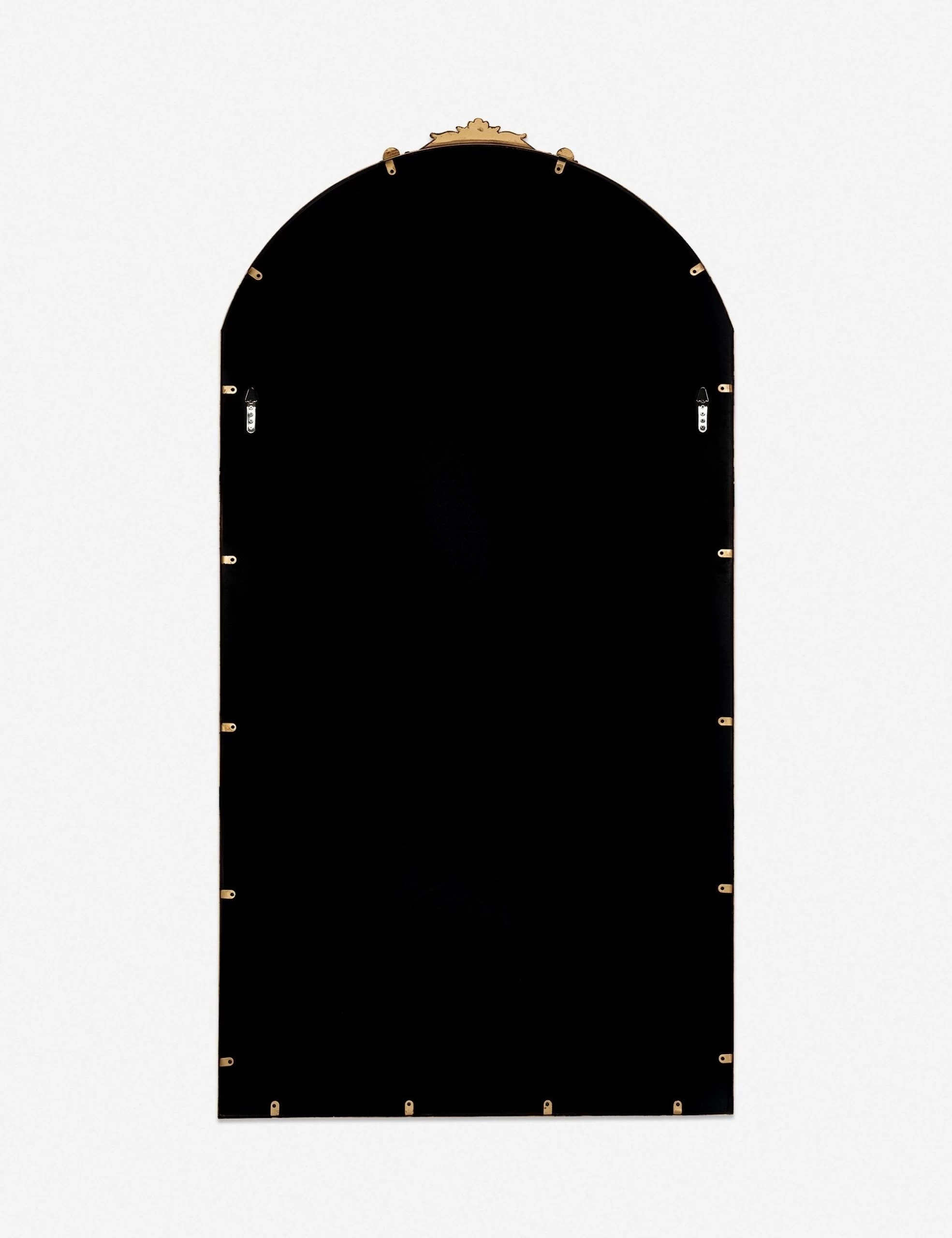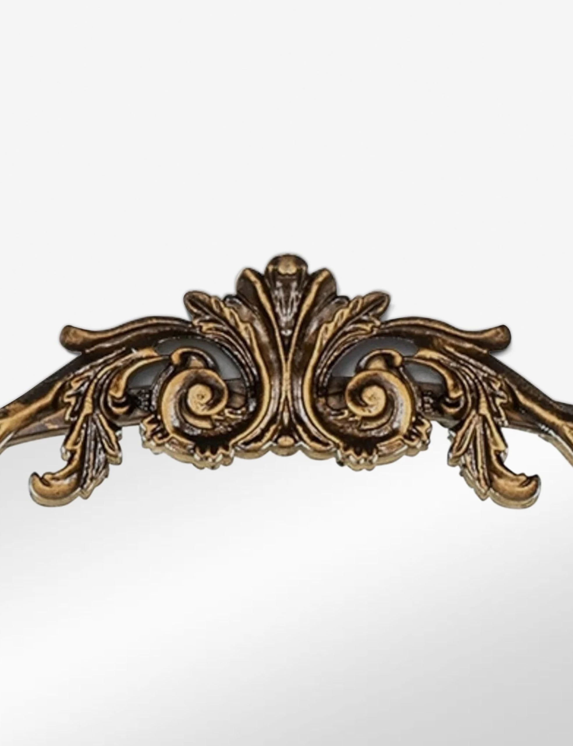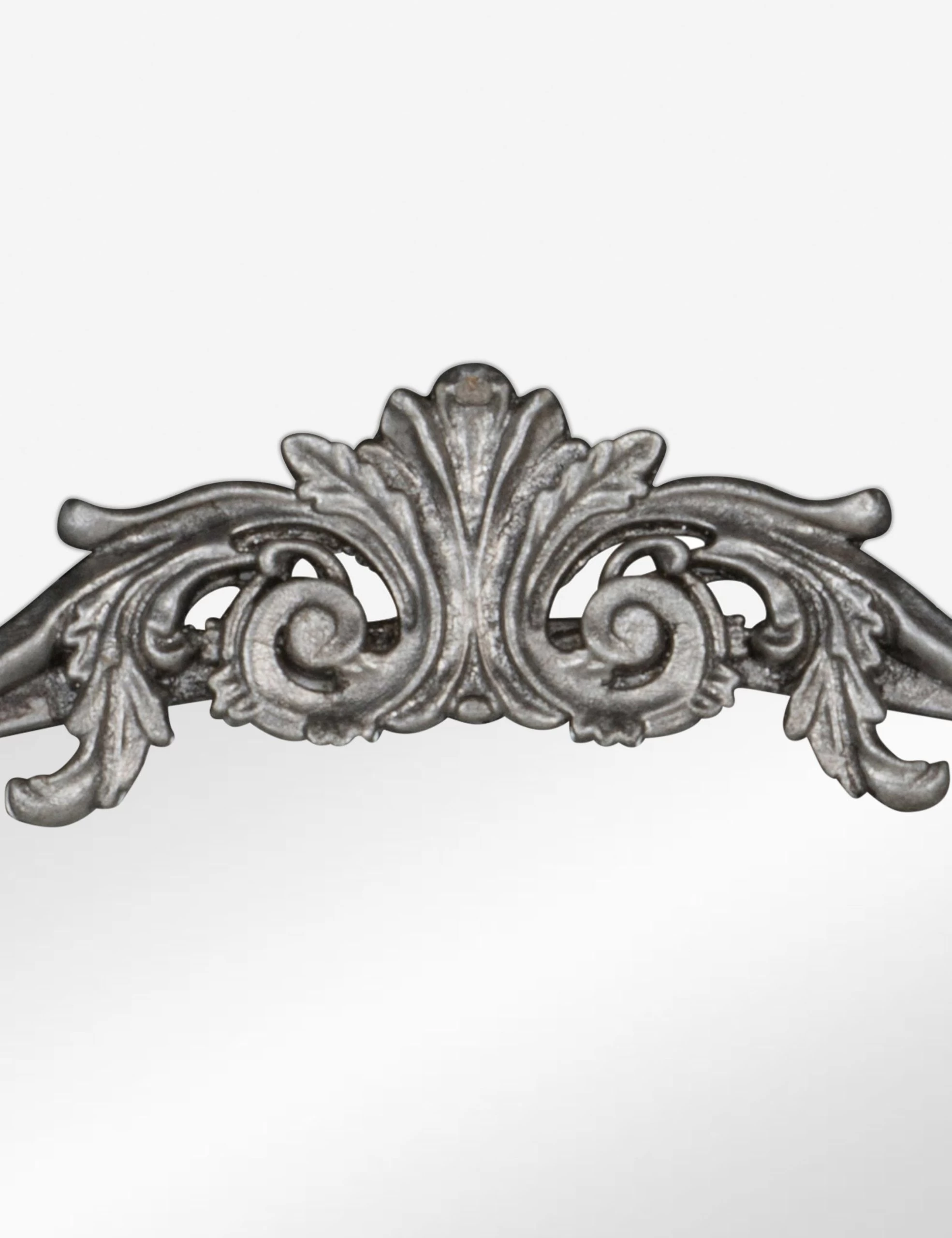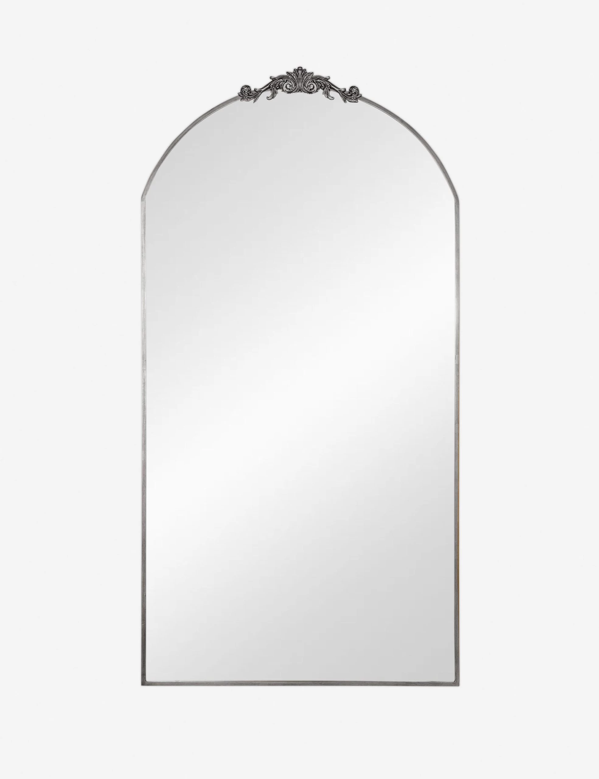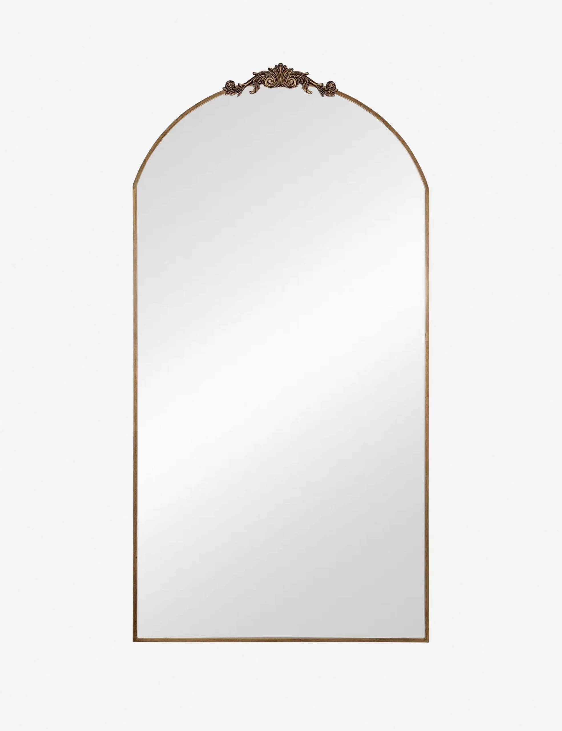 A large ornate floor mirror with impressive style. The Tulca curved standing mirror features a flat bottom edge and traditional scroll detailing at the apex of the metal frame, making it the perfect vintage-inspired full-length mirror for entryways, dining rooms, or bedrooms alike.