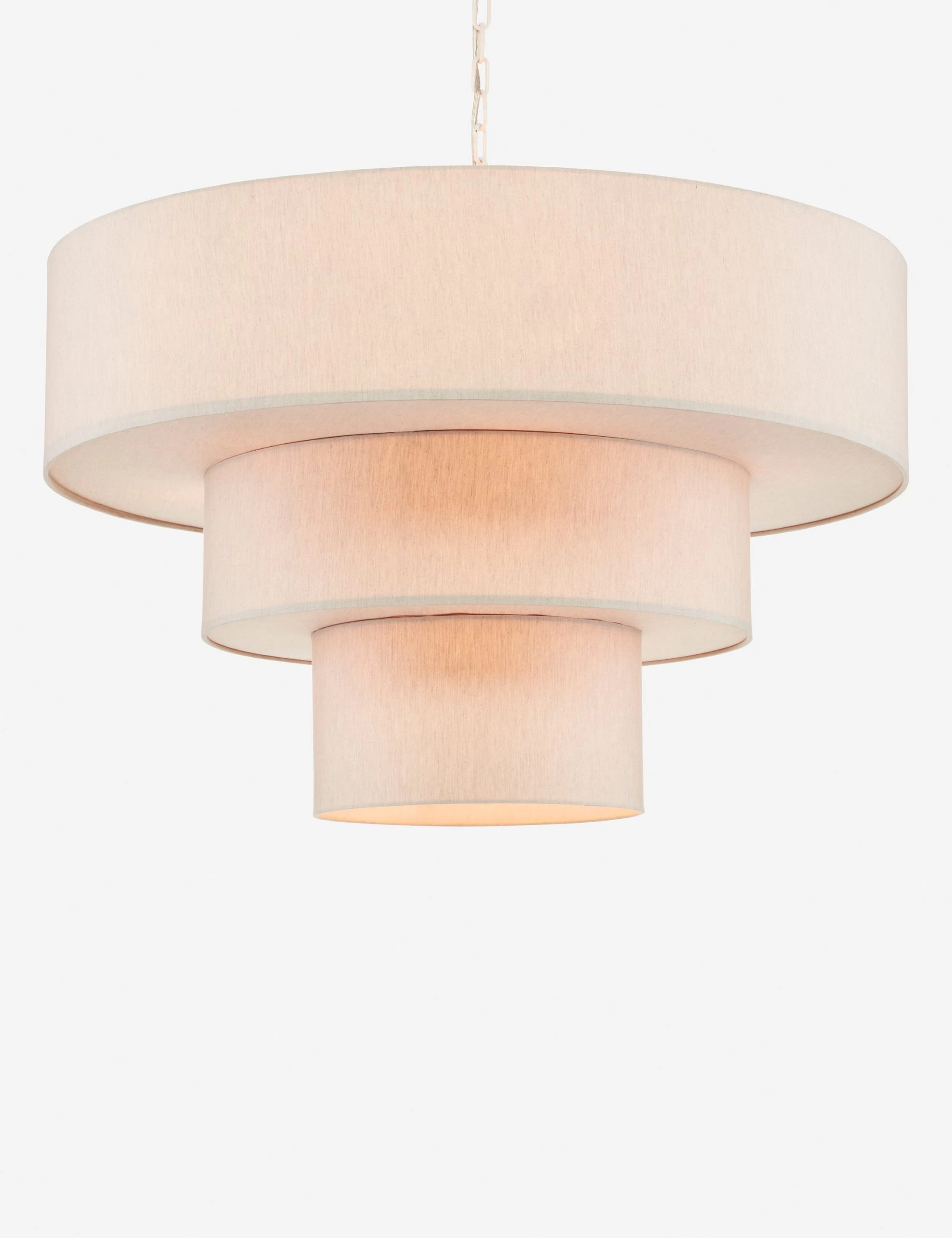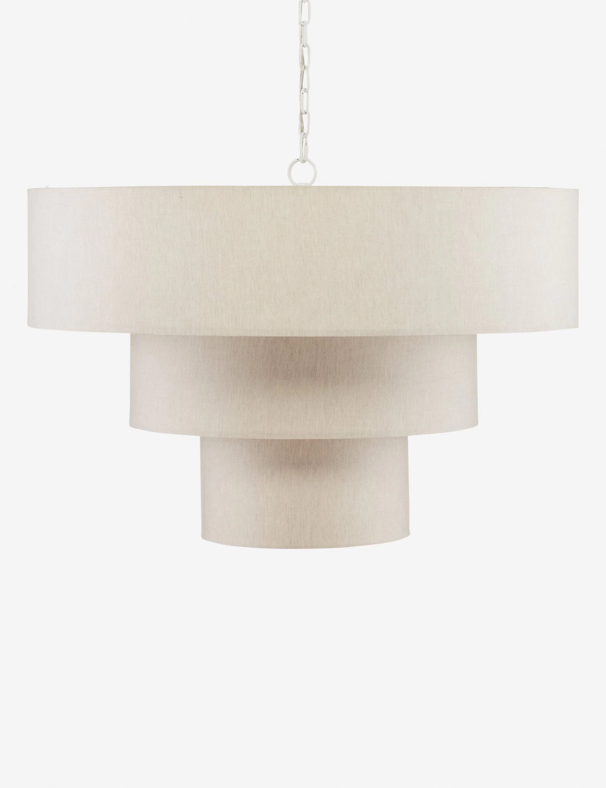 Set the tone for elegance with this beautifully refined chandelier design. The triple-drum shades are wrapped in linen, offering a subtle woven texture that perfectly completes the glossy white finish of the chain. With its natural fiber covering and closed bottom, this chandelier casts a smooth pour of light throughout the room.