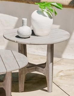 The Valerie coffee table offers a rustic style set for modern design. With its round, plank top and sculpted cross base, this wood coffee table cuts a balanced silhouette finished for impact. The solid teak construction is made for lasting quality outdoors or in for seasons to come.