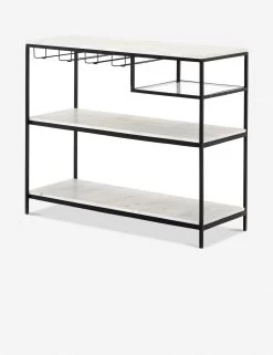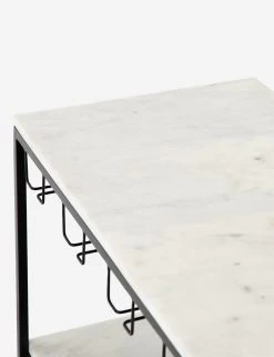 White marble shelving adds a luxe tone to the airy black iron frame of this bar console. The hanging racks are perfect for wine glasses, while the floating glass shelf offers a dramatic touch for barware essentials. Style this unique console in your kitchen or dining room, or as a sofa table for elevated hospitality.
